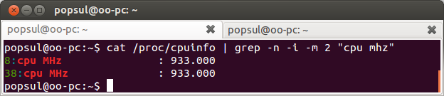 cat /proc/cpuinfo | grep -n -i -m 2 "cpu mhz"