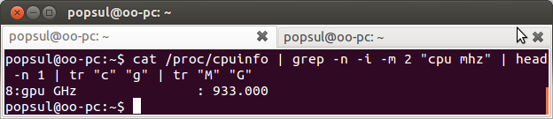 cat /proc/cpuinfo | grep -n -i -m 2 "cpu mhz" | head -n 1 | tr "c" "g" | tr "M" "G"